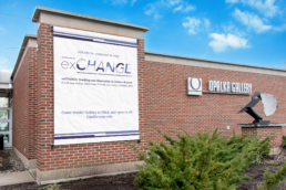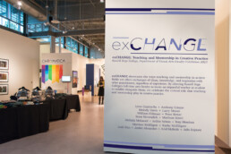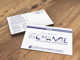 A reimagined design created to advertise Russell Sage College’s exhibition exCHANGE. Imagery includes a postcard sent to guests, an outdoor banner, and a title wall within the Opalka Gallery.